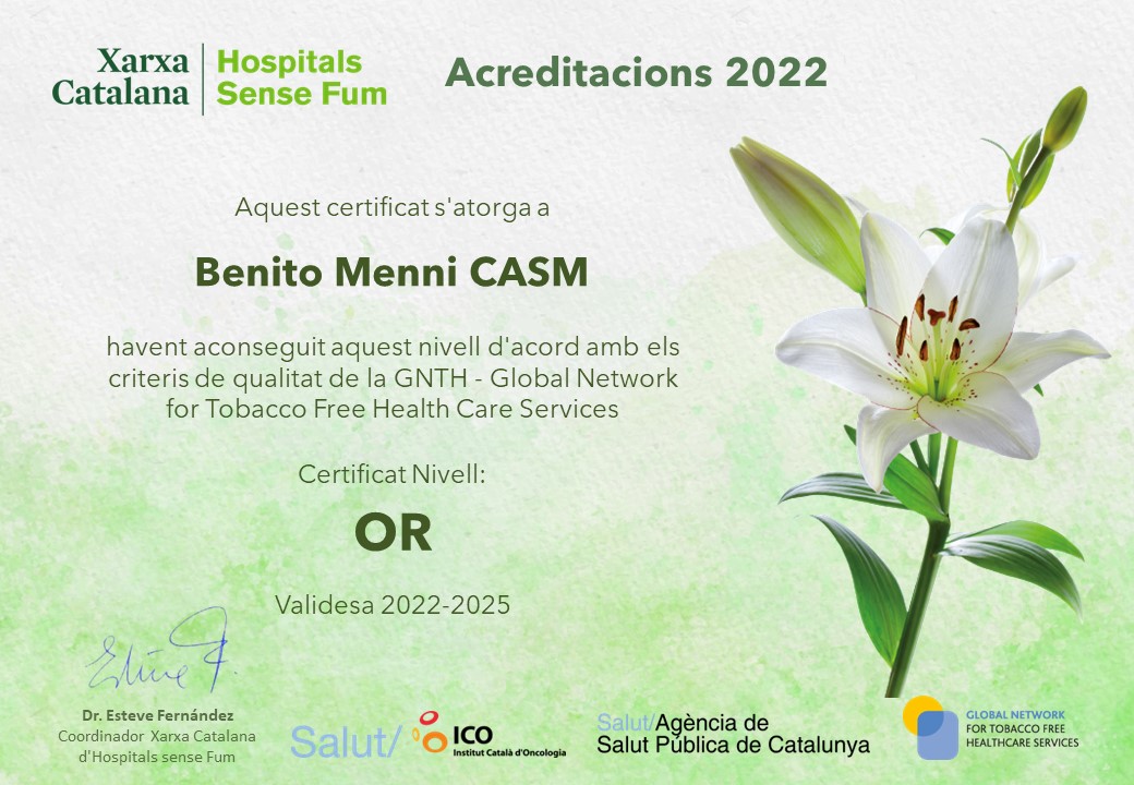 Els indicadors de qualitat del projecte acreditats el 2011 mostren un bon nivell al Qüestionari Selfaudit (110/168). L’hospital compta amb personal format en tabaquisme i una Unitat de Deshabituació Tabàquica ha ajudat a deixar de fumar a treballadors i pacients ingressats.